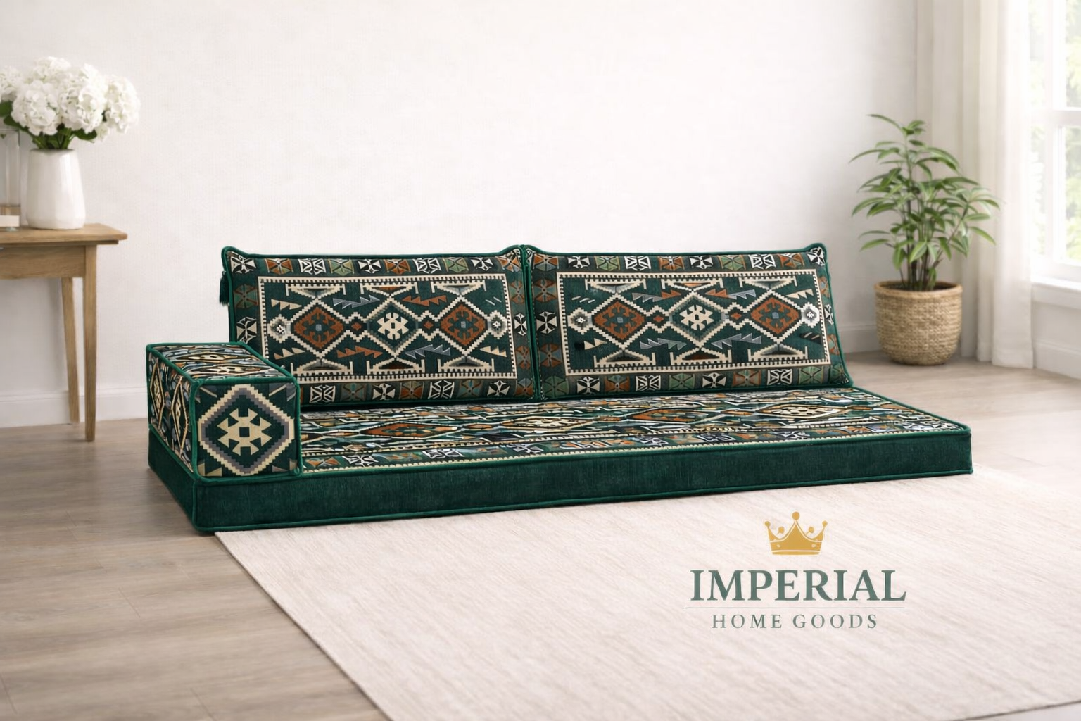 Arabic Majlis Floor Seating Auckland designed in a deep green geometric pattern, ideal for traditional floor seating, family gatherings, and Majlis-style living spaces. This Arabic Majlis set brings cultural elegance and comfort to modern homes across Auckland.