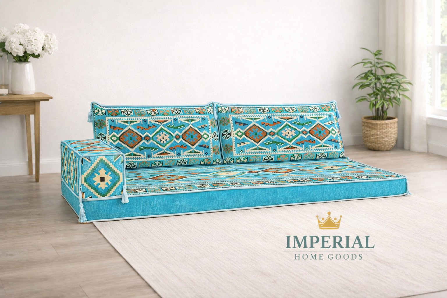 This Arabic Majlis floor seating features a striking teal geometric pattern designed for modern and traditional interiors. Ideal for Majlis rooms, floor seating areas, and guest spaces.