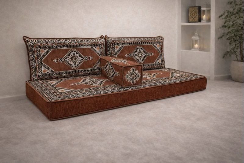 This Arabic Majlis floor seating features a rich brown base with traditional geometric patterns, designed for Majlis and floor seating spaces.