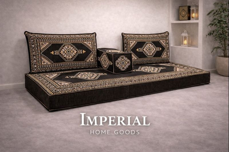 Arabic Majlis Floor Seating Charcoal Black Gold is designed for traditional floor seating in family homes, prayer rooms, and Majlis spaces.