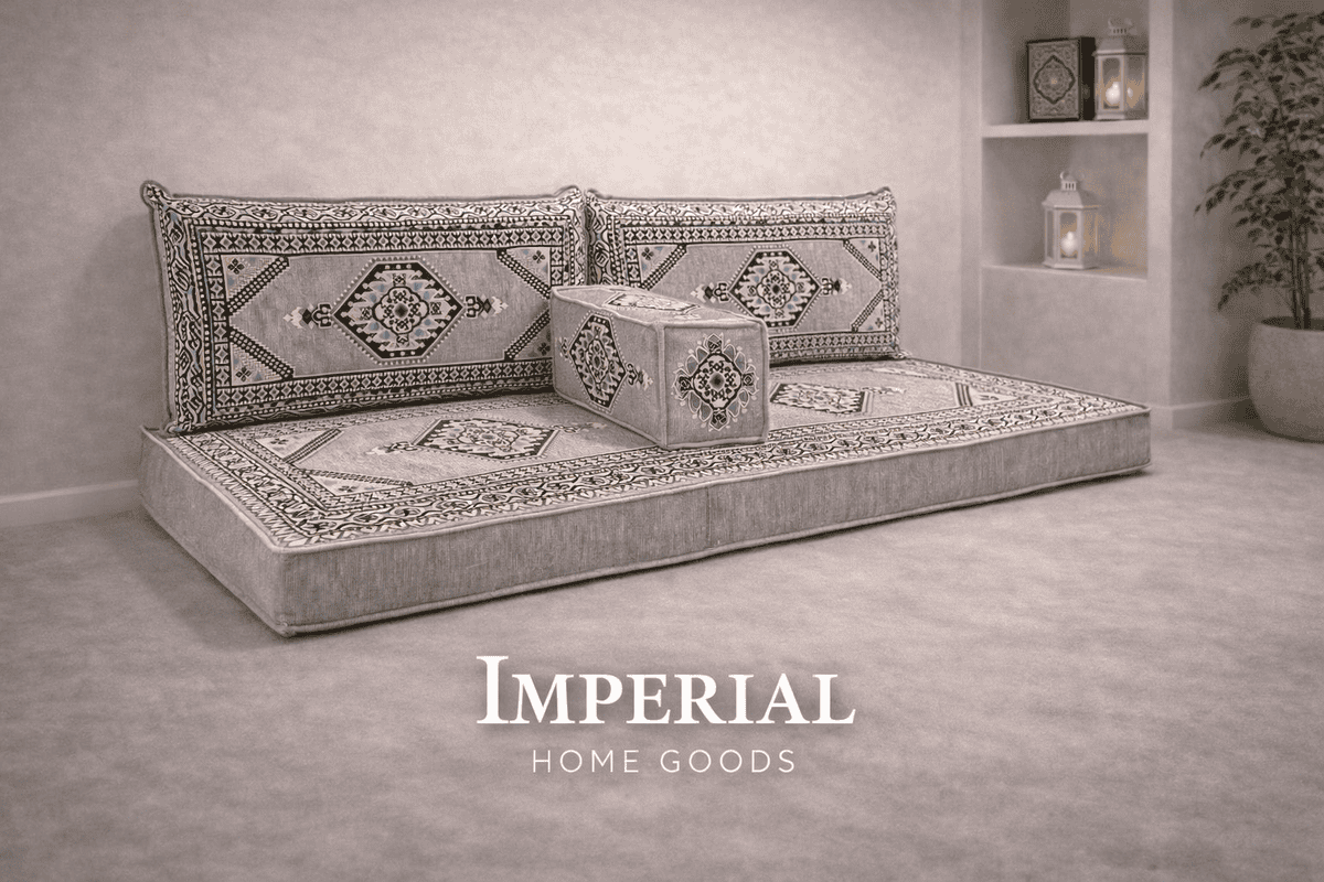 Arabic Majlis Floor Seating in an elegant grey pattern, designed for comfortable floor seating in modern and traditional homes across Auckland.