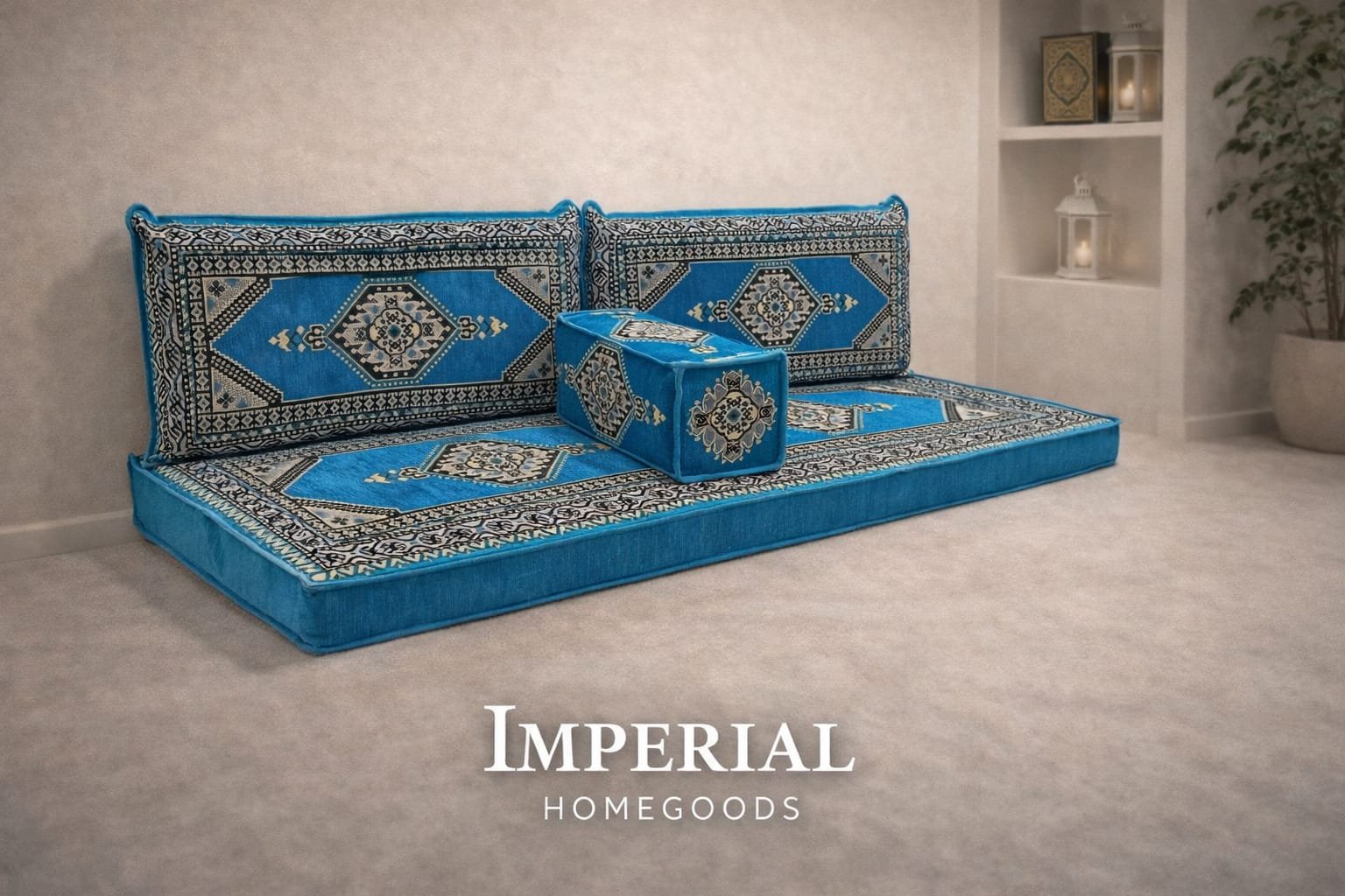 Arabic Majlis Floor Seating in a teal blue-grey pattern, designed for comfortable Majlis and floor seating arrangements.